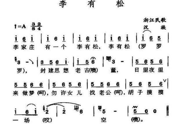 李有松,這是一首浙江省的牧童山歌作品,該曲子是用詼諧的曲調(diào)來尖銳地批評了李有松包辦婚姻的封建思想。一開頭的歌詞是;“李家莊有一個李有松,李有松咯咯喂,封建思想老古咯董咯喂!边@個旋律非常富有朗誦性,也是具有即興編唱的特點,它的表現(xiàn)手法也是非常地簡潔,整個曲子只有二個樂句,每樂句唱兩、三句歌詞,一字一音,排列緊密。兩個樂句的尾部都在末子前插入一個特強的延長音,拉開歌腔,加深了戲謔以及嘲笑的效果。有的人評論:當(dāng)時中國的第一部“婚姻法”才剛公布,這一首歌也許就是為了配合“婚姻法”來進行宣傳。